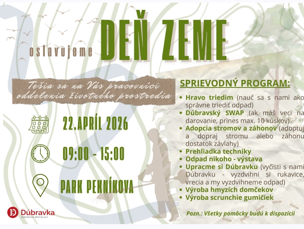 Mestská časť Bratislava - Dúbravka pozýva na spoločný Deň Zeme v areáli na ulici Pekníkova. Všetci sú srdečne vítaní.